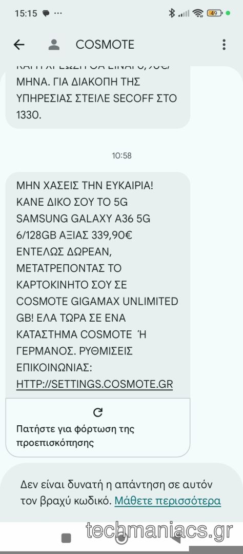Ενημερωτικό μήνυμα που λάβαμε πριν από λίγη ώρα στο κινητό μας, σε καρτοκινητό What’s UP. Η Cosmote ενημερώνει ότι το Samsung Galaxy A36 5G 6 128 GB δίνεται δωρεάν σε συνδρομητές καρτοκινητής, οι οποίοι θα επιλέξουν να μεταβούν σε νέο συμβόλαιο και συγκεκριμένα στο Cosmote Gigamax Unlimited. Είναι μία από τις μεγάλες προσφορές που κάνει η Cosmote το τελευταίο διάστημα με δωρεάν συσκευή και η οποία θα ισχύει για όλο τον Μάρτιο, αν και όπως έχουμε γράψει και στο παρελθόν, δεν είναι σίγουρο ότι αξίζει.