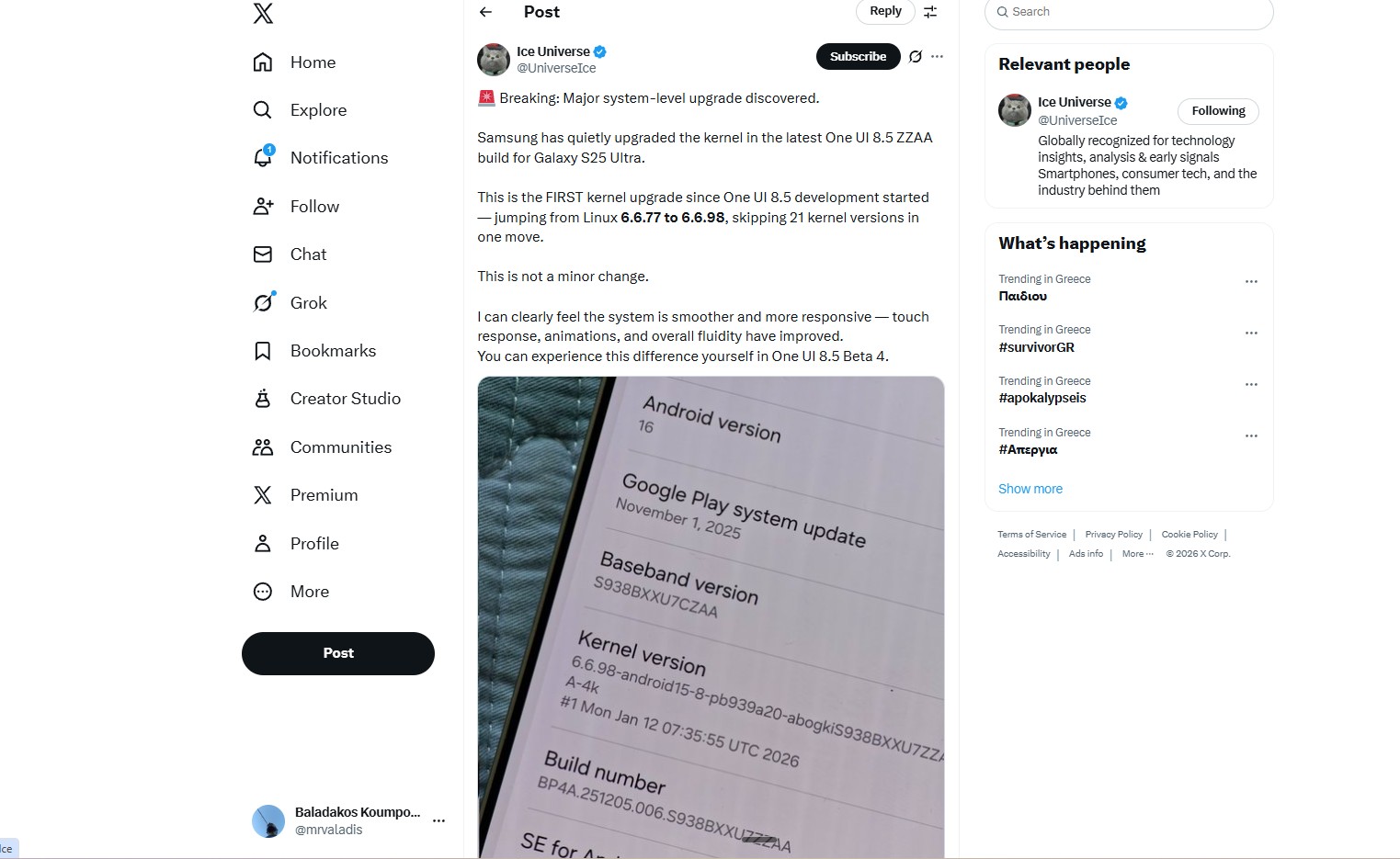 Ο λόγος για τον Ice Universe ο οποίος αναφέρει ότι η Samsung φαίνεται να έχει αναβαθμίσει το kernel στις πρόσφατες One UI 8.5 beta builds, με το Samsung Galaxy S25 Ultra να πηγαίνει από την έκδοση 6.6.77 στη 6.6.98. Πρόκειται δηλαδή για μια αναβάθμιση περισσότερων από 21 εκδόσεων Linux Kernel, κάτι που θα σημαίνει πιο ομαλό χαρακτήρα στον τρόπο με τον οποίο το interface συμπεριφέρεται, όταν η εν λόγω έκδοση θα κάνει το επίσημο ντεμπούτο της παγκοσμίως.