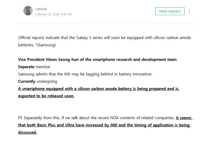 Σύμφωνα με μια έκθεση από το Naver, η Samsung πως ο ανταγωνισμός της από την Κίνα είναι πολύ μπροστά στην μάχη της αυτονομίας (και να ήταν μόνο αυτό…). Για αυτό, η Samsung ετοιμάζει μπαταρίες άνθρακα πυριτίου για τα μελλοντικά Galaxy S τηλέφωνα. Βέβαια, τίποτα από αυτά δεν είναι επίσημο, ούτε γνωρίζουμε πότε η Samsung θα φέρει τη νέα τεχνολογία στις συσκευές της. Σύμφωνα με τις πηγές όμως, η εταιρεία ήδη δοκιμάζει τις μπαταρίες άνθρακα πυριτίου σε μια συσκευή, ώστε να δει πως όλα είναι όπως πρέπει.