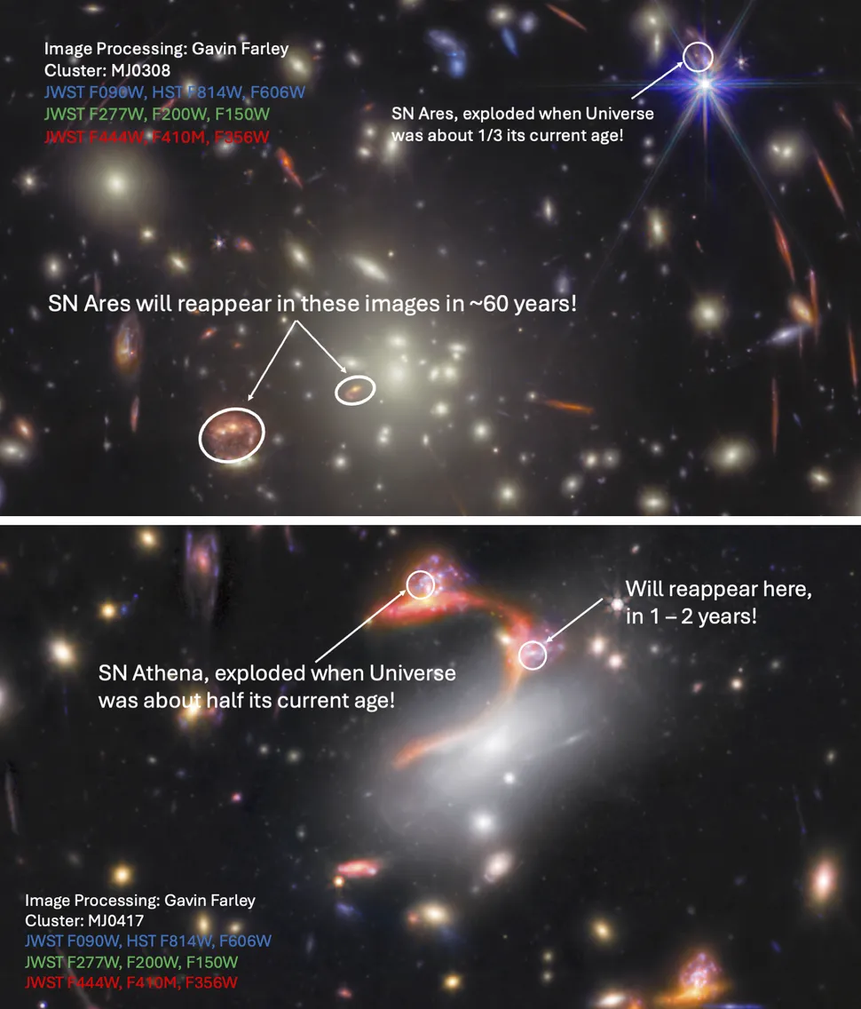 Το SN Ares είναι η πρώτη έκρηξη Supernova που ανακαλύφθηκε μέσω του προγράμματος Venus. Αξίζει να σημειωθεί ότι η έκρηξη συνέβη πριν από περίπου 10 δισεκατομμύρια χρόνια και η παραμόρφωση του χωροχρόνου, η οποία προκλήθηκε από ένα σύμπλεγμα γαλαξιών, έκανε το φως από αυτό να χωριστεί σε τρεις εικόνες. Η μία έχει ήδη φτάσει στα τηλεσκόπιά μας. Ωστόσο, το φως από τις άλλες δύο υφίσταται μια σημαντική επιβράδυνση λόγω της διαφορετικής διαδρομής που ακολουθεί το φως μέσα στο καμπυλωμένο χωροχρόνο. Κάτι τέτοιο με απλά λόγια σημαίνει ότι οι δύο εικόνες του SN Ares θα φτάσουν σε περίπου 60 χρόνια σε μας. Πρόκειται για ένα φαινόμενο το οποίο δεν έχει συμβεί ποτέ στο παρελθόν με τόσο μεγάλη καθυστέρηση, όπως σημειώνει ο Larison.