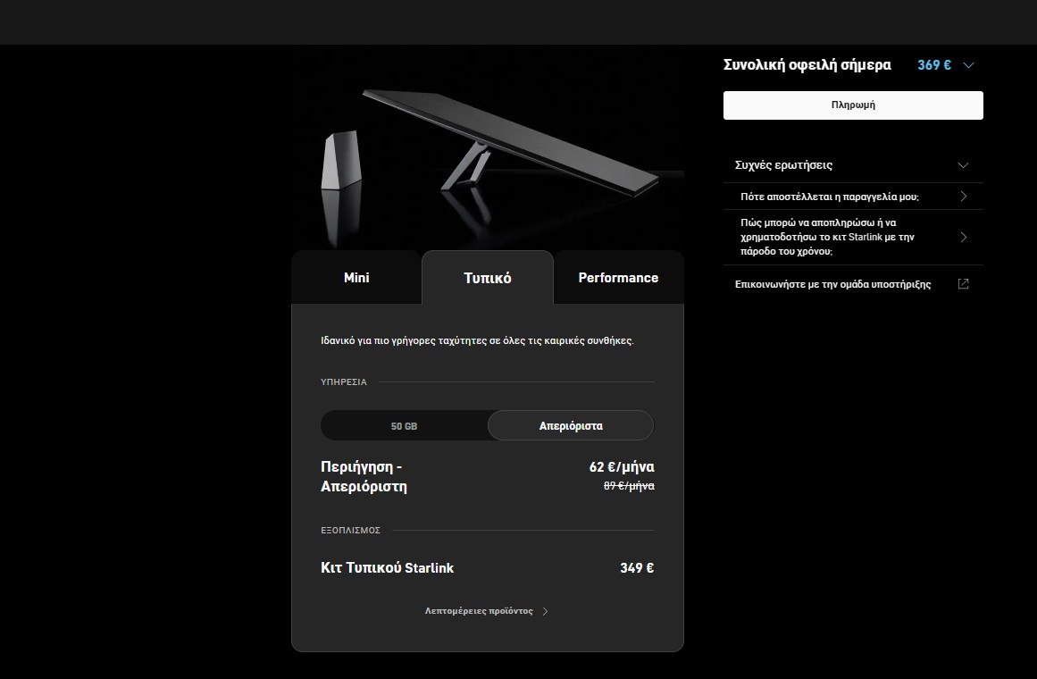 Το Starlink mini, το Standard Kit και το Performance Kit, με το τελευταίο να είναι και το ακριβότερο. Και στα τρία πακέτα των εξοπλισμών, βλέπουμε το πρόγραμμα με τα απεριόριστα δεδομένα να το δίνει σε έκπτωση 62 ευρώ κάθε μήνα, για 6 ολόκληρους μήνες.