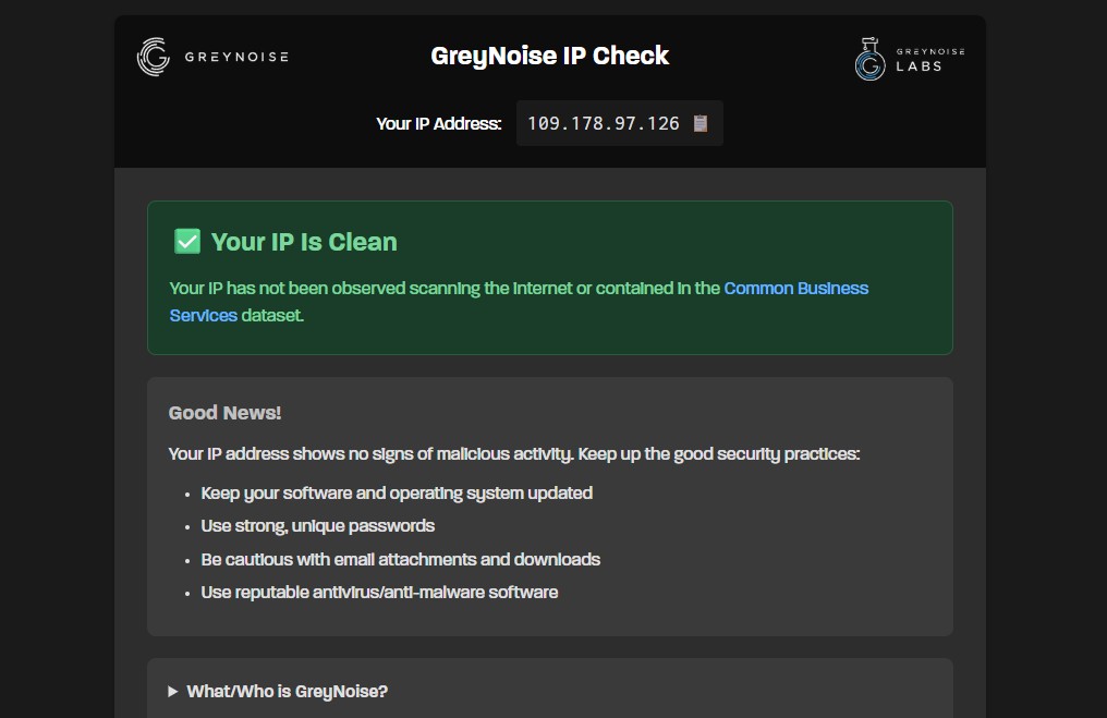 Η GreyNoise προέβη στην επίσημη κυκλοφορία ενός δωρεάν εργαλείου, το οποίο φέρει την ονομασία GreyNoise IP Check και το οποίο υπόσχεται να ελέγξει αν η IP σου έχει εμπλακεί σε επιβλαβείς λειτουργίες scanning, όπως για παράδειγμα αν αποτελεί μέρος ενός botnet δικτύου ή ως residential proxy.
