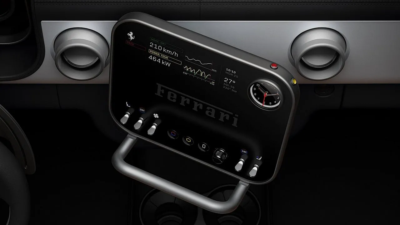 Η κεντρική οθόνη είναι και αυτή OLED στις 10,12 ίντσες, με ένα κάλυψα γεμάτο οπές, ώστε να εμφανίζονται τα όργανα όπως στις παλιές Ferrari, ενώ στο κάτω μέρος θα βρούμε φυσικούς διακόπτες, για τον έλεγχο λειτουργιών του οχήματος. Ο κεντρικός πίνακας είναι περιστρεφόμενος, ώστε να ταιριάζει στις ανάγκες του χρήστη.