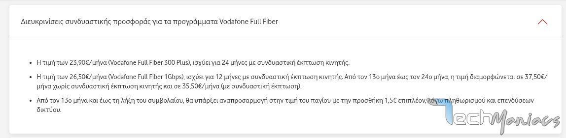 Όπως έχουμε δει πολλές φορές εδώ στο techmaniacs.gr και από παλαιότερες προσφορές, το μεγάλο μειονέκτημα τέτοιου είδους προσφορών είναι η αύξηση που θα έχεις στην τιμή μετά τους 12 μήνες. Δηλαδή το συμβόλαιο είναι 24μηνο, ωστόσο η προσφορά ισχύει για τους 12 πρώτους μήνες. Παράλληλα, ένα μεγάλο αρνητικό στοιχείο είναι το γεγονός ότι υφίσταται ακόμη μία αύξηση της τάξεως του 1,5 ευρώ μετά τους 12 μήνες λόγω πληθωρισμού και επενδύσεων δικτύου, όπως αναφέρει η Vodafone στη σελίδα. Επίσης, παίζει και 1Gbps με 20.90 για όλη τη διάρκεια του συμβολαίου από τη Nova σε προσφορά για λίγες ημέρες.