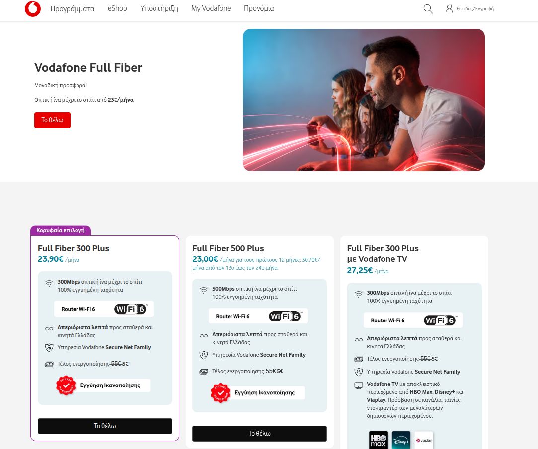 Με την Εγγύηση Ικανοποίησης απολαμβάνεις τα προγράμματα Full Fiber 300Mbps Plus, Full Fiber 500Mbps Plus, Full Fiber 1Gbps Plus και Vodafone All+ χωρίς δέσμευση για τους πρώτους 2 μήνες. Ζήσε κι εσύ την εμπειρία με υπερυψηλές ταχύτητες και οπτική ίνα μέχρι το σπίτι!