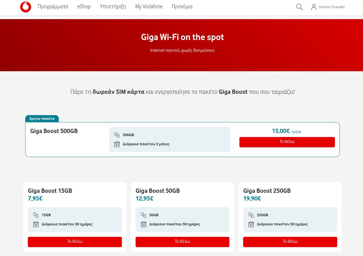 Η Vodafone άρχισε να προωθεί σε πιο εμφανές σημείο το νέο πακέτο που είχε παρουσιάσει σχετικά πρόσφατα, δηλαδή πριν από λίγους μήνες. Ο λόγος για το Vodafone Giga Boost 500 GB, η διάρκεια του οποίου είναι 3 μήνες.