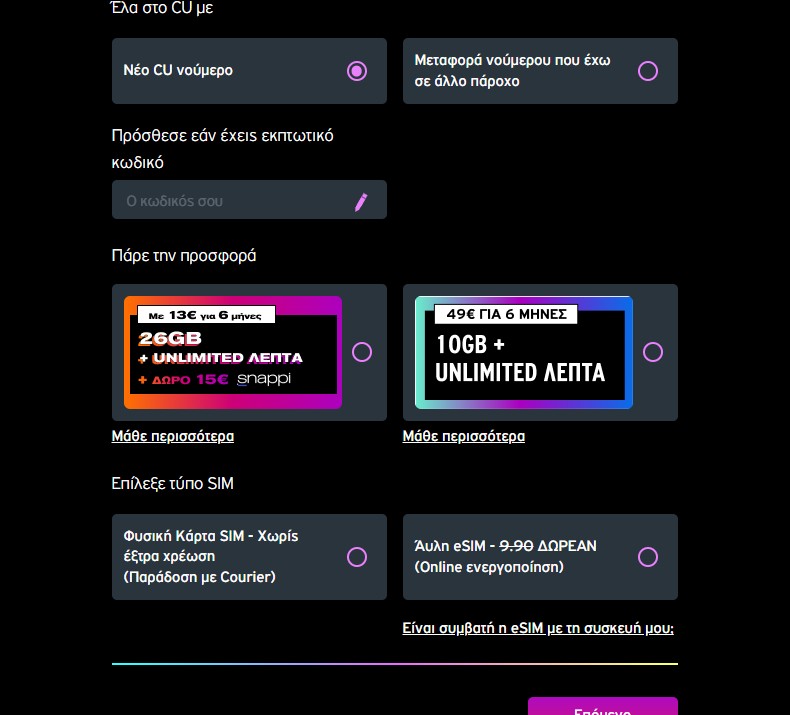 - Για τους πρώτους σου 6 μήνες στο CU κερδίζεις κάθε μήνα 10GB, Απεριόριστα Λεπτά Ομιλίας και 100 SMS προς όλους μόνο με 49€ χωρίς να χρειάζεται να ξαναβάλεις κάρτα.