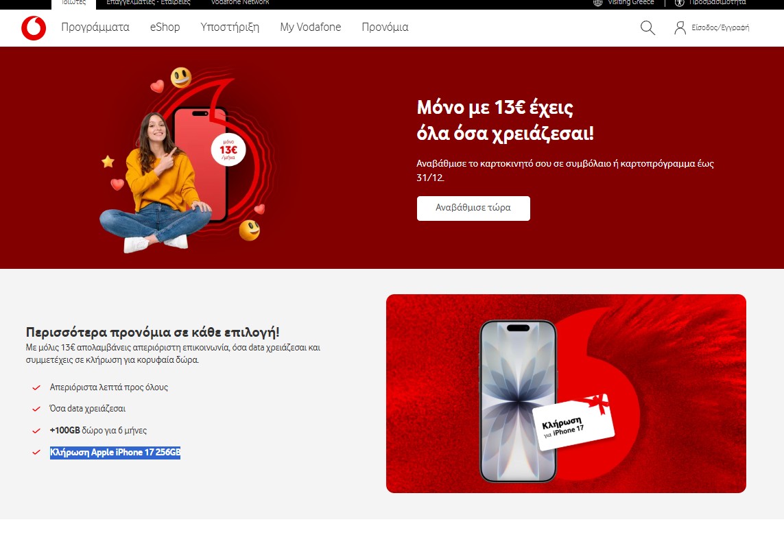 Παράλληλα, όπως αναφέρει η εταιρεία, μπαίνεις στην κλήρωση για ένα Apple iPhone 17 με κάθε νέο συμβόλαιο που θα γίνει με μετατροπή του καρτοκινητού σου.