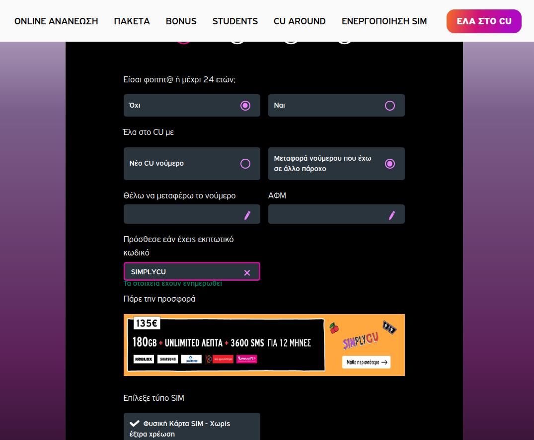 Για να μπορέσεις να το πάρεις, θα πρέπει στην σχετική ενότητα παραγγελίας καρτοκινητού να βάλεις τον κωδικό Simply CU, όπως δείχνει η εν λόγω εικόνα. Αφορά και φορητότητα, αλλά και νέο αριθμό, ενώ δίνεται και σε όσους δεν είναι φοιτητές.