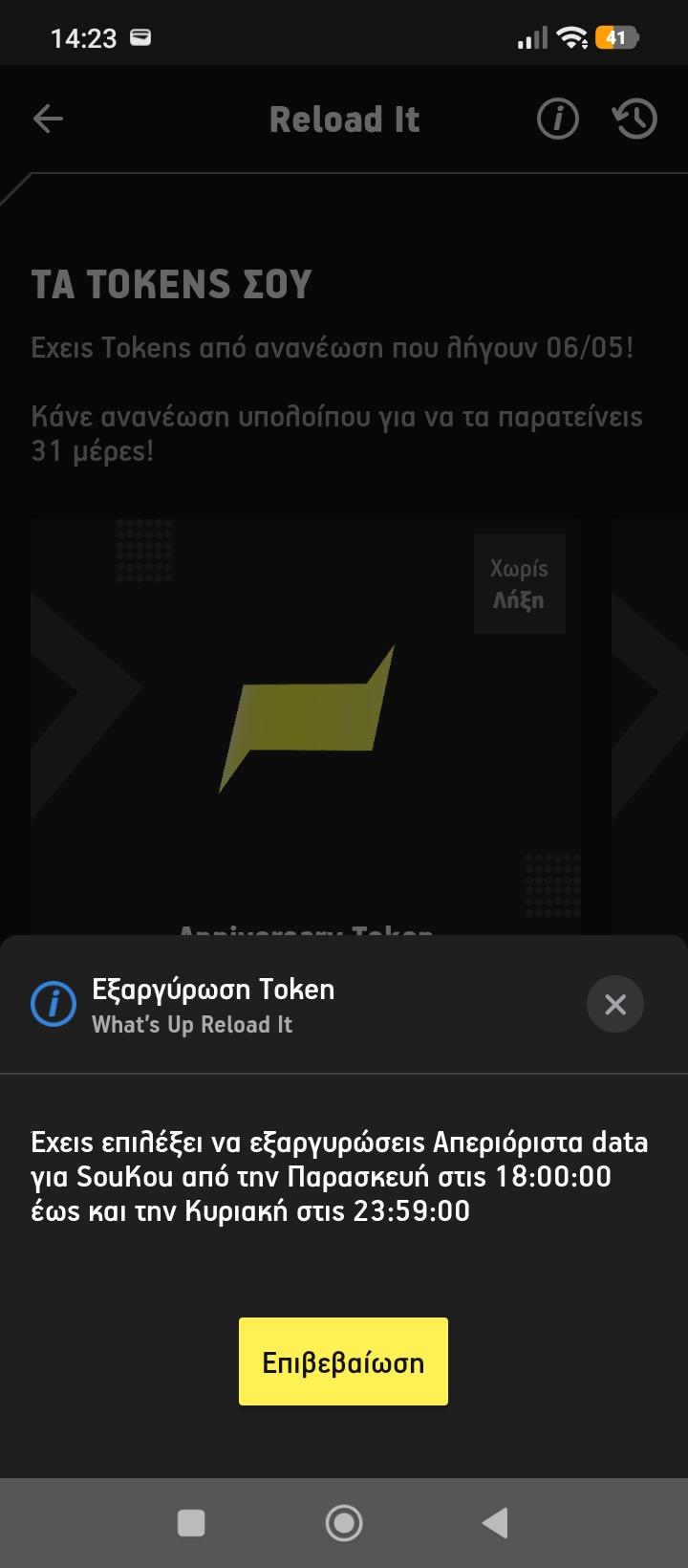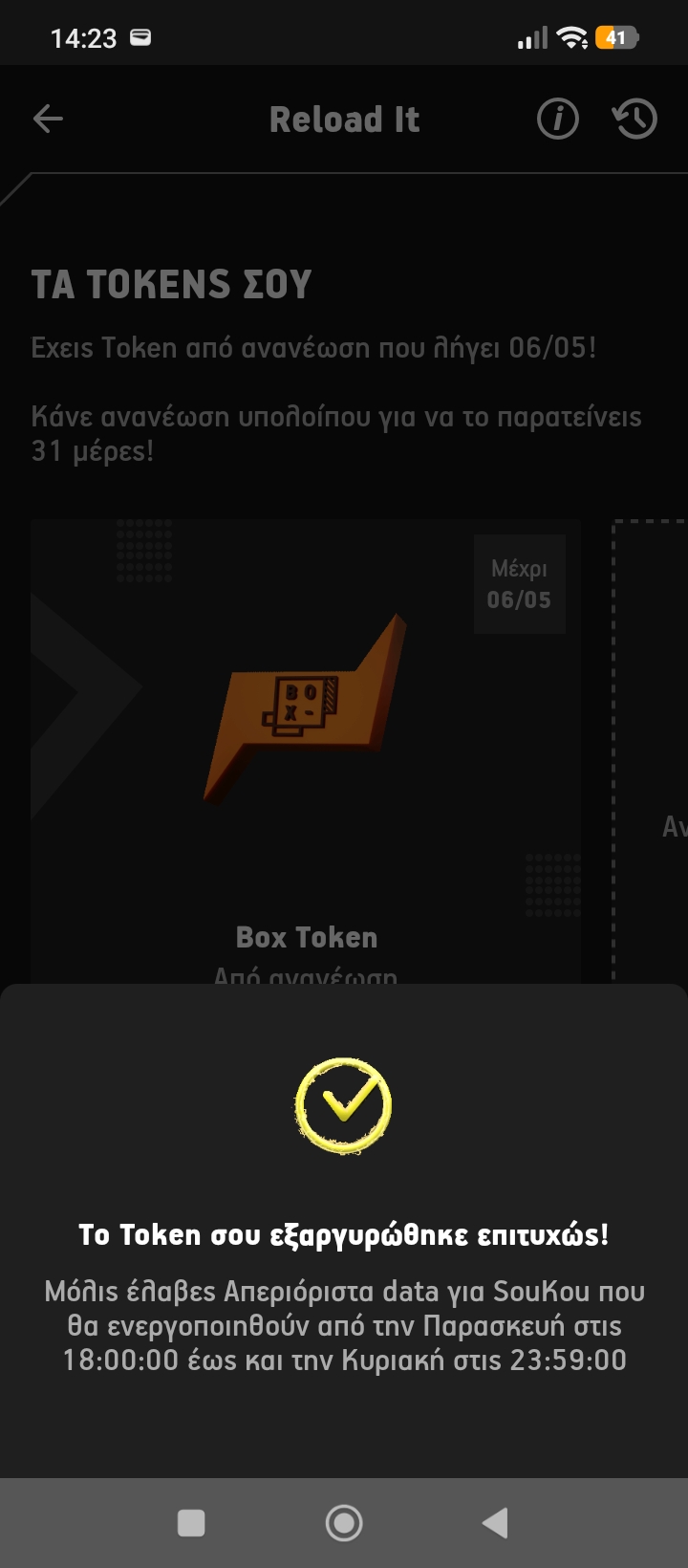 Πρόκειται για ένα token το οποίο σου δίνει τη δυνατότητα να αποκτήσουμε απεριόριστα data για δύο ημέρες και πιο συγκεκριμένα μας το έδωσε και το Σουκού. Το token, όπως λέει και η ονομασία του, θα στο δίνει κάθε φορά που κλείνεις χρόνο παραμονής στη Cosmote.